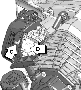 - Set the choke lever (C) to the "RUN" position (choke open/down), not the "COLD START" position (choke closed/up). Press the purge bulb (D) until fuel fills the bulb and flows back to the fuel tank through the clear line.