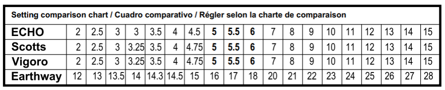 - Check the product label: Most fertilizer, grass seed, and ice melt bags include spreader setting charts. Customers should use the setting comparison chart if one of the following brands—Scotts, Vigoro, or Earthway—is listed on the material they wish to spread. For example, if a bag of fertilizer recommends using a Scotts setting of 4.75, refer to the chart to see that this equals an ECHO® setting of 4.5.